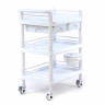 Манипуляционный трёхполочный стол, сделанный из белого пластика, полки - пластик цвета "Морская волна", с трёхсторонними боковыми ограждениями на всех полках